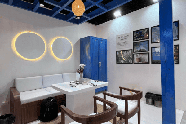 A mediterranean-themed booth, with archways, textured finishes, and breezy colour tones, brought coastal Europe to the heart of Mumbai. Fresh, airy, and full of character—it was the perfect setting to showcase Iberchem’s vibrant fragrance palette.