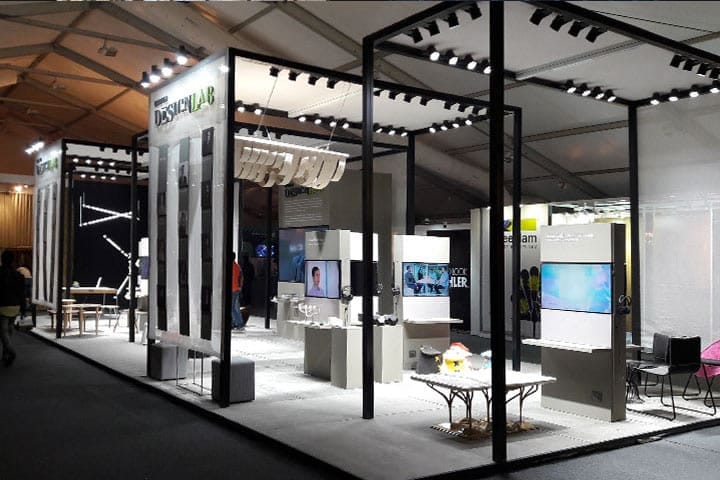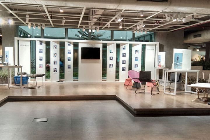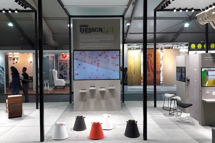 This stand-out exhibit stall was a well-thought blend of the sleek blacks and the graceful whites. Authentic highlighting of show areas with focus lights. Tall and sleek, modern setup. For Godrej Design Lab, First Rain did justice to the classy displays it had to offer. The style captured was modern. The exhibit portrayed a play between textured shadows and patterns; with the popping of bright, blissful colours.