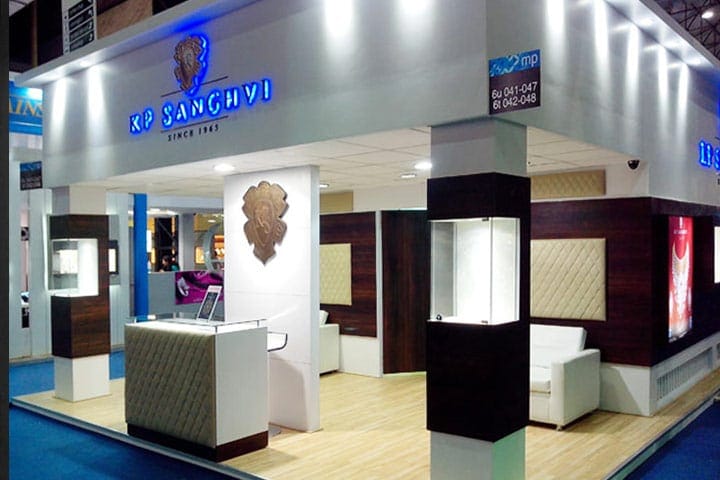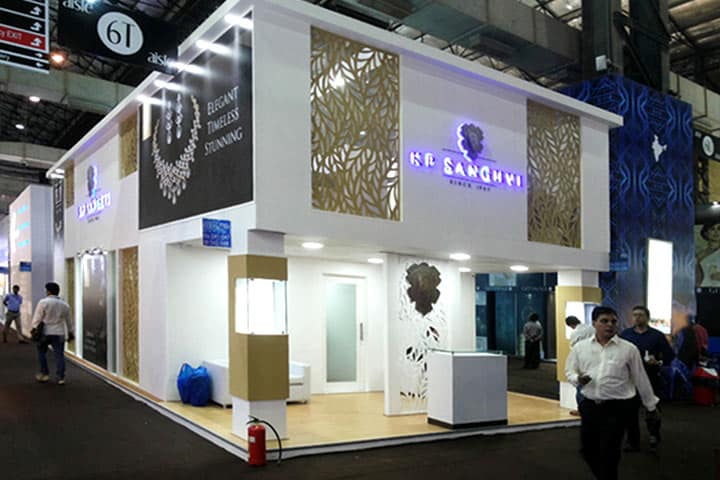 This mezzanine structure was designed in a way to keep the functional requirement of the client in sync with the design. The pillars at the front were smartly used as the display for the jewellery. The jali work enhanced the overall look of the stall and gave the feel of gold work.