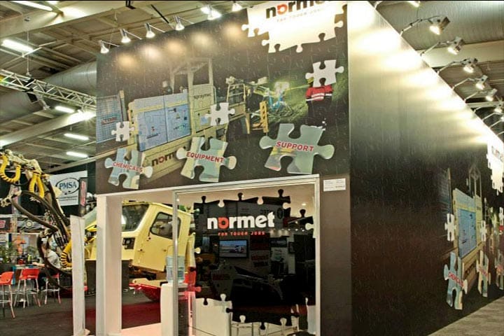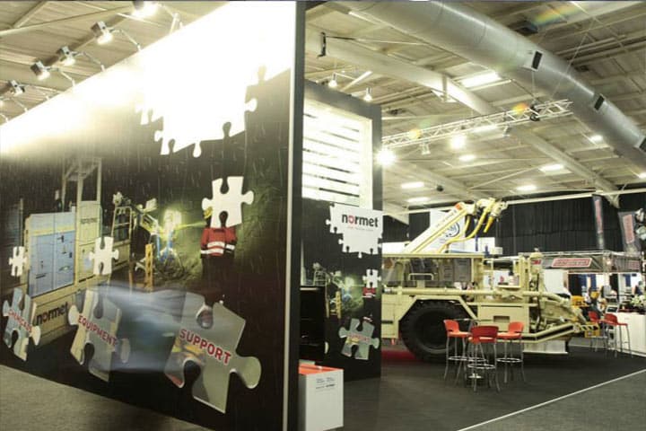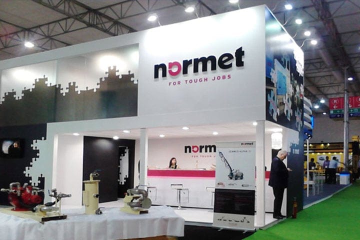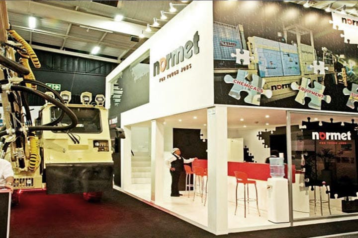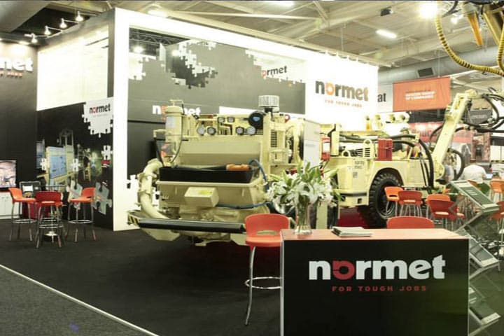 Buoyed by its success in India, Normet carried forward the same exhibition stand design to Johannesburg. This was a mezzanine exhibition stall with the reception and refreshment counters at level 1 along with its machinery display. Level two was solely dedicated to meetings and gave a splendid view of the exhibition hall. Bold branding and super large graphics conveyed the brand message, “Normet – For Tough Jobs”.