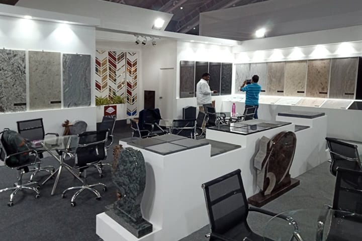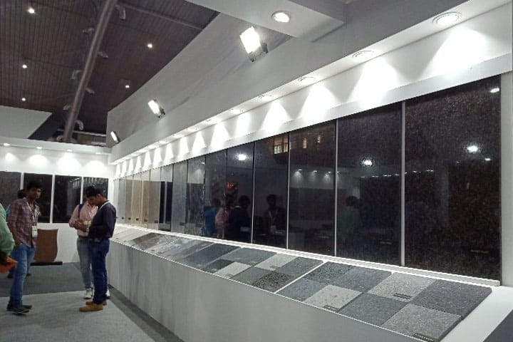 A well-arranged display with a wall for graphics and two receptions on either side to address the visitors with some seating space in the middle utilized the stand space cleverly. A straight wall of the display was given along with an angular display. The granites were displayed both on the exterior of the stall along with the interiors.